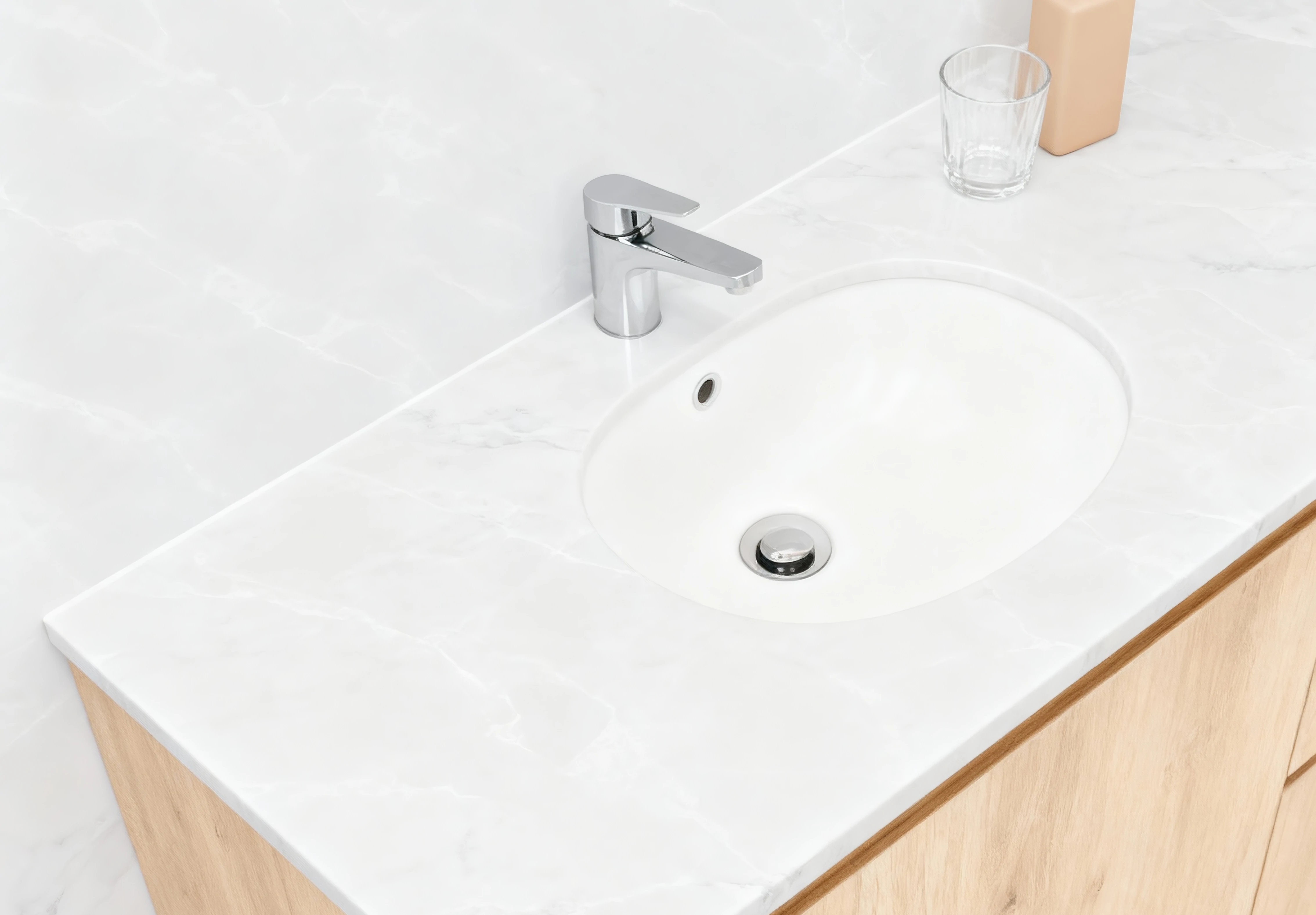 | Móveis de banheiro | Acabamento fosco suave | 15–20 mm | Bege / Taupe Claro |